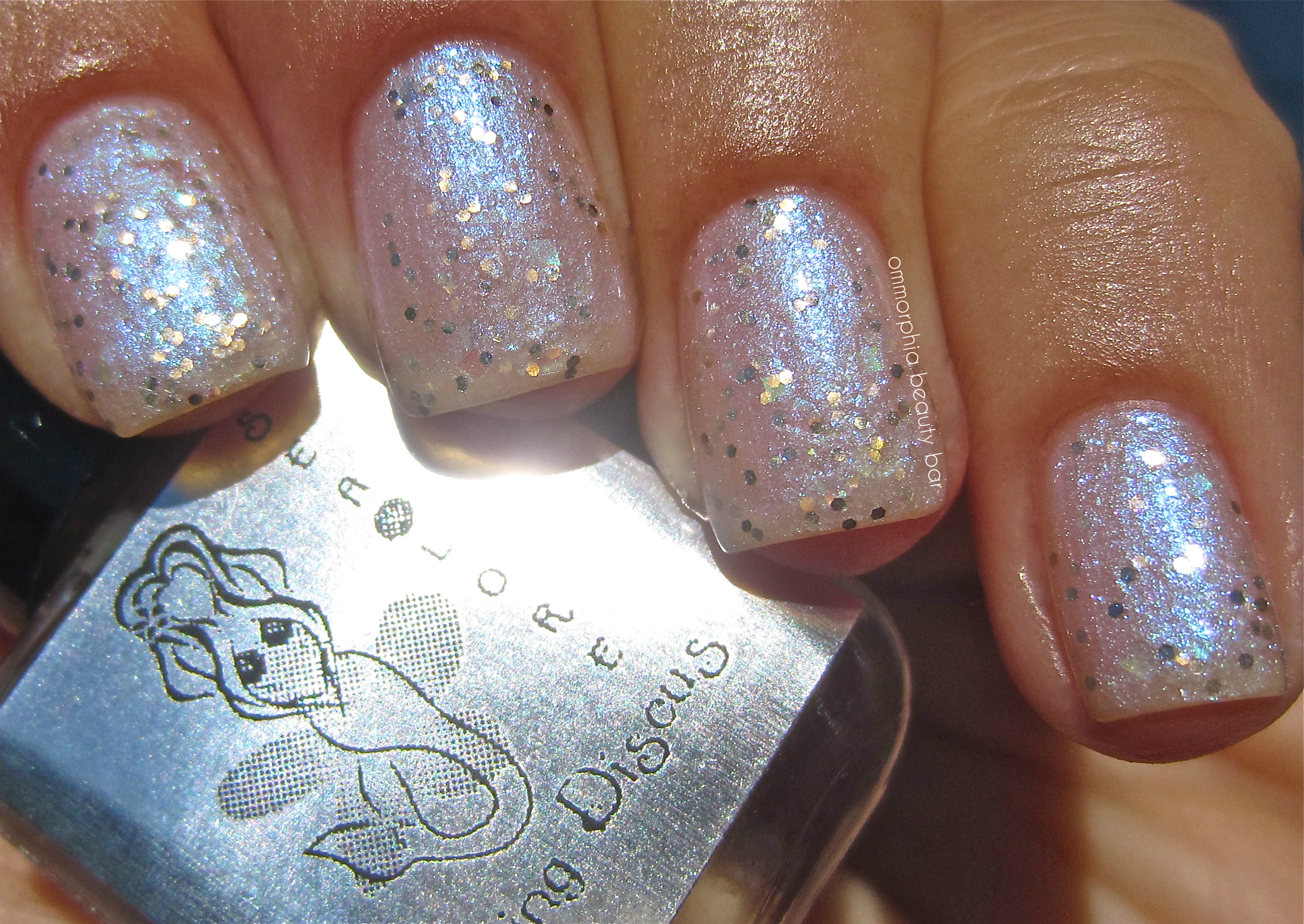 Dancing Discus – a delicate and sheer-leaning pearly base hue filled with fine gold hexagonal glitter and larger prismatic mylar square glitter pieces in a formula with an amazing flow. Versatile enough to be layered over any other solid shade for more drama, I absolutely love the understated beauty of it worn alone. A totally unique combination of glitter and colour-shifting effect which gives off an almost unearthly luminous glow – gorgeous! Coats applied: 3 thin, plus top coat