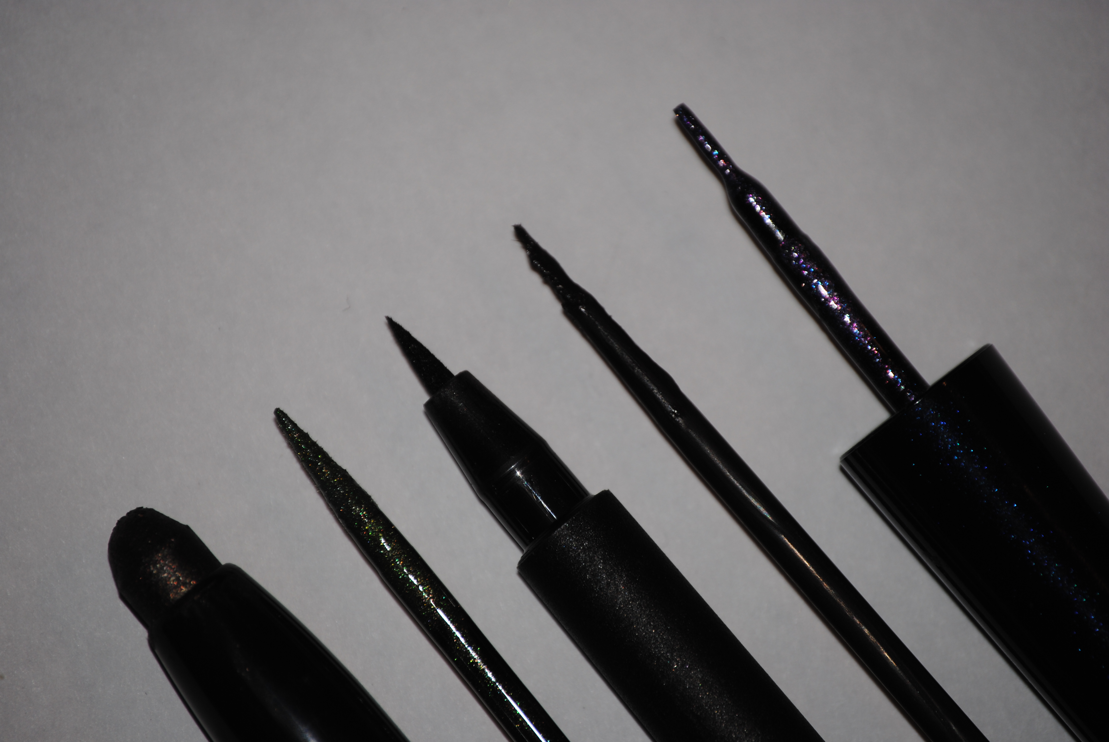 From the above five swatches, the product that continues to be exceptionally useful to me, is MAC’s ‘Rapidblack’ Penultimate Eyeliner (2nd from left). From its felt-pen like tip, to the comfortable wand, this is the most goof-proof way to apply liquid liner, especially for anyone who fears not having a steady hand. Part of MAC’s permanent range, I highly recommend this pen for its ease of use, great density of pigment and long-lasting wear. The Greasepaint Stick (left) from MAC’s 2010 Venomous Villains Collection, is an item I have yet to make good use of, although I find its finish intriguing; a little dirty-looking, I can see it working well for a smudgy bedroom-eyes look, with its subtle bronze glints adding that extra touch. The deep shimmery emerald green on MAC’s ‘Treat Me Nice’ (center) from MAC’s 2010 Fabulous Felines Collection, with its highly defined pointed felt tip and intense pigmentation, is another creative way to line the eyes with a touch of colour, without ever looking too overdone. The YSL black (2nd in from the right) was my first black liquid liner, and it shows: the formula has thickened somewhat and the brush splays upon application – time to put this one to rest. Finally, Dior’s #174 ‘Sparkling Purple’ from the 2009 Christal Boréale Collection, may have started out life much denser, but upon swatching, I discovered that the formula has not only thinned, but it also looks like the colour has changed. Still, I do like this new shade and so, it may just hang around a bit longer.