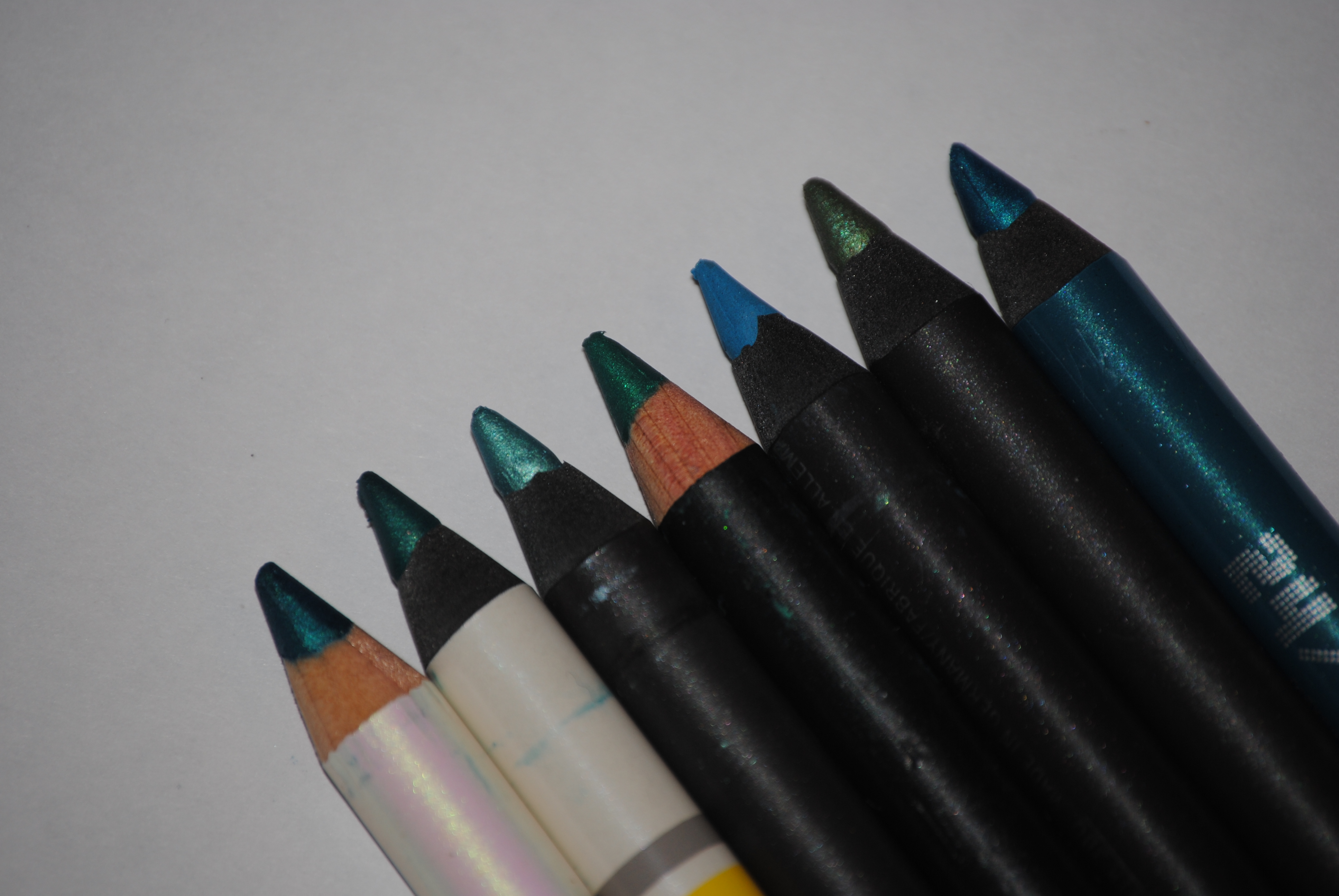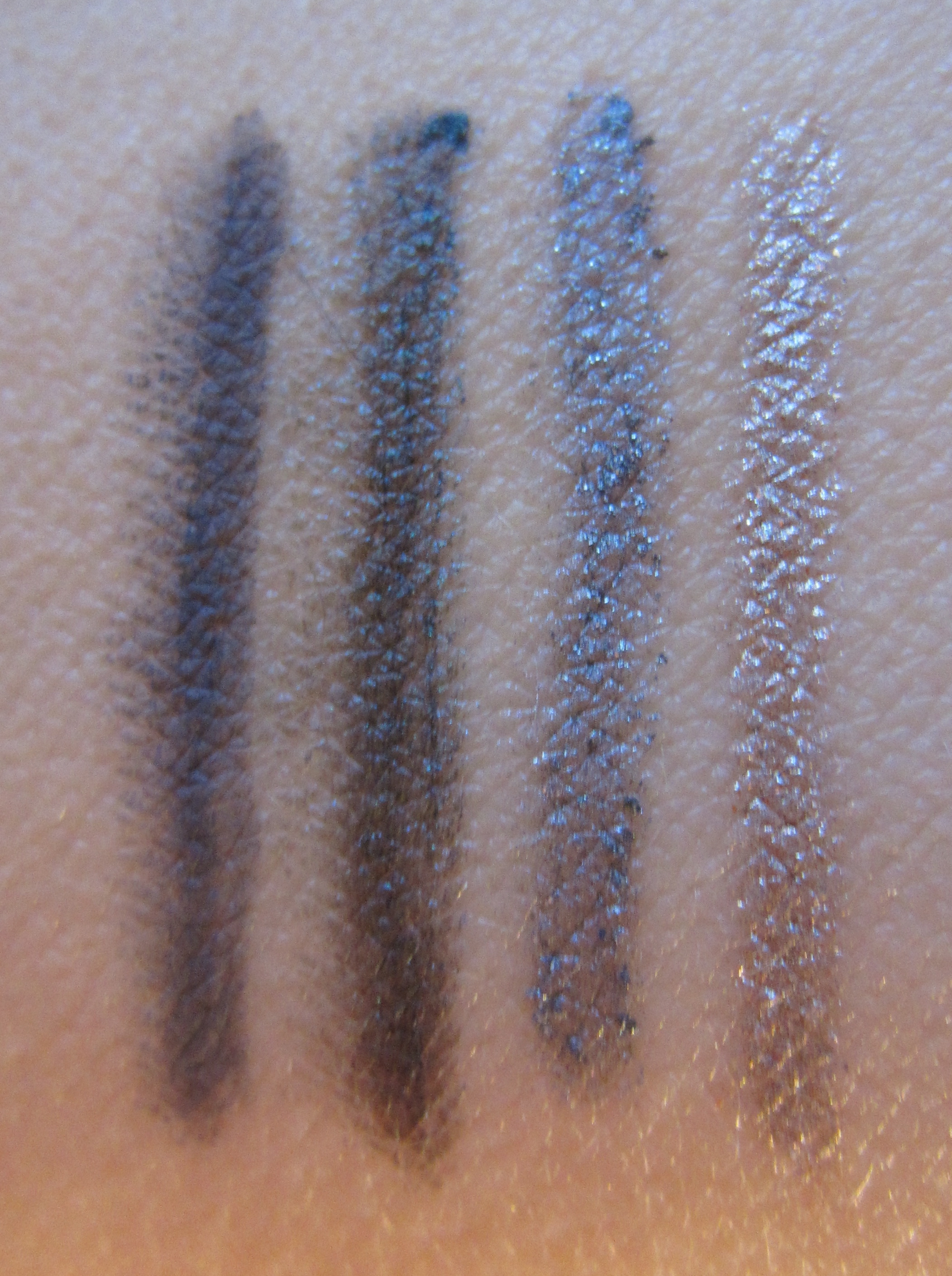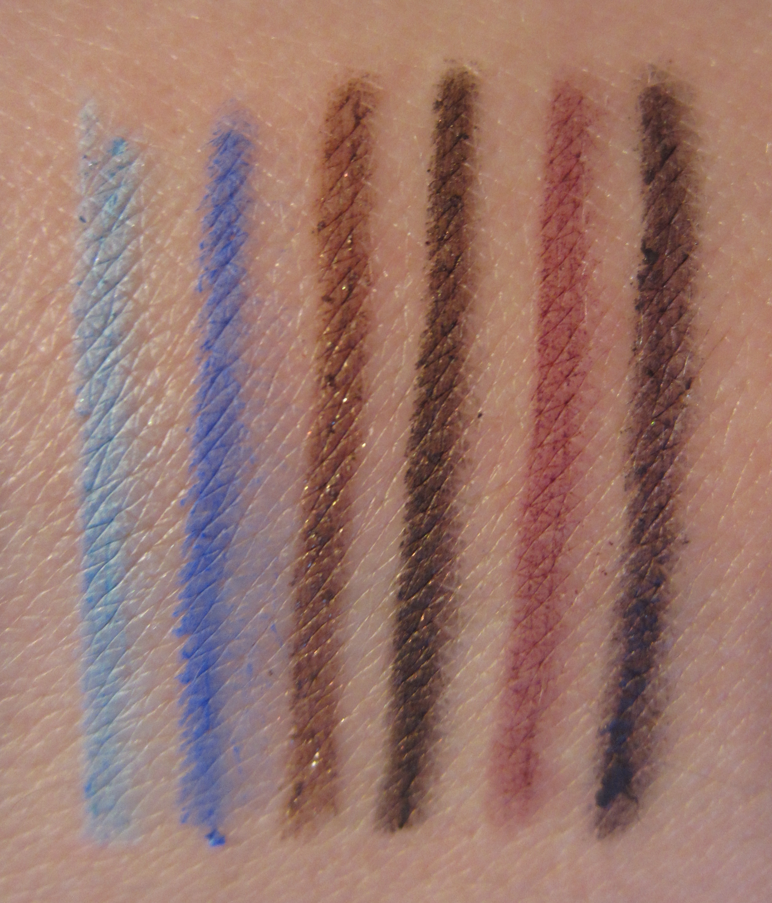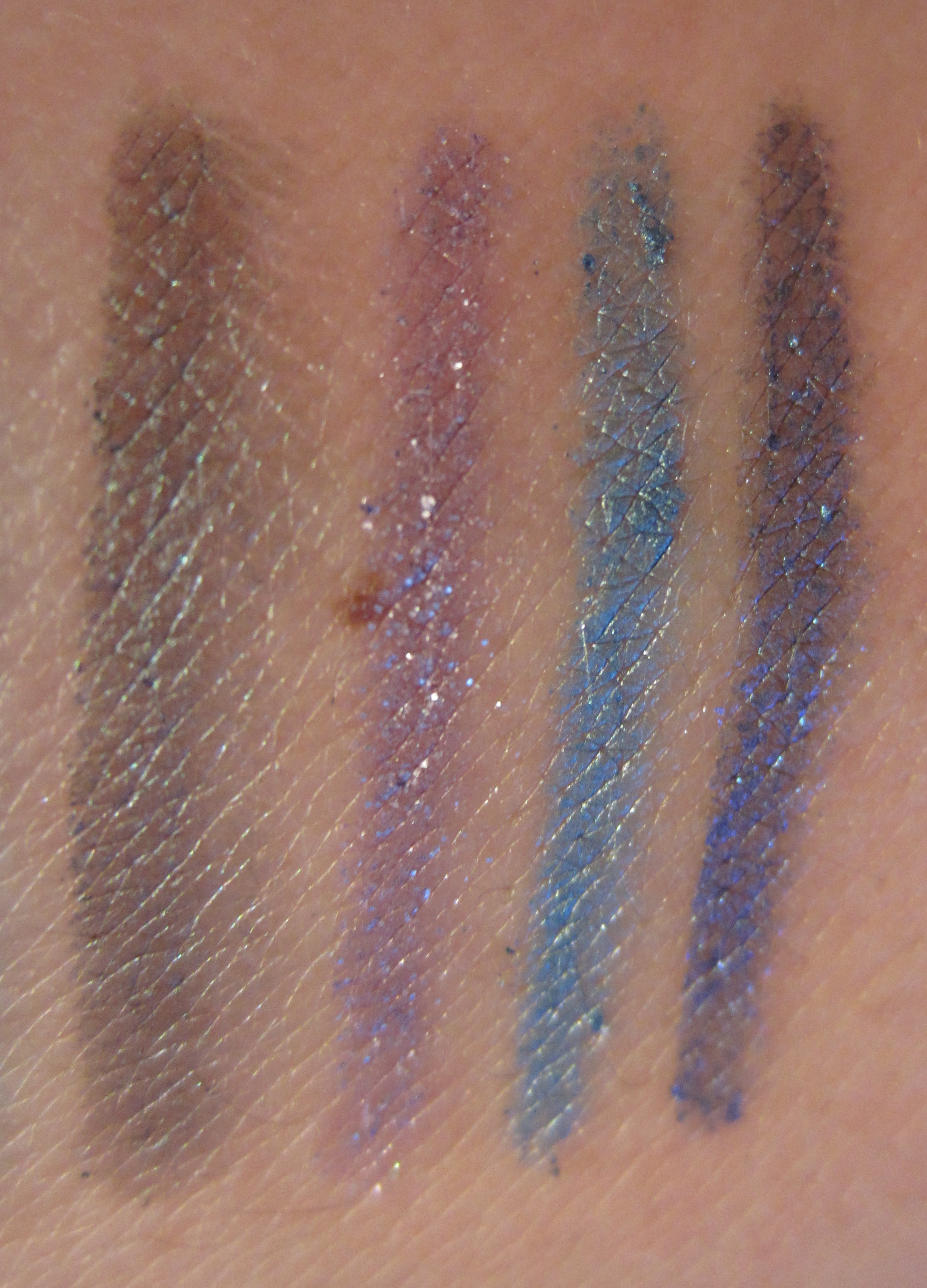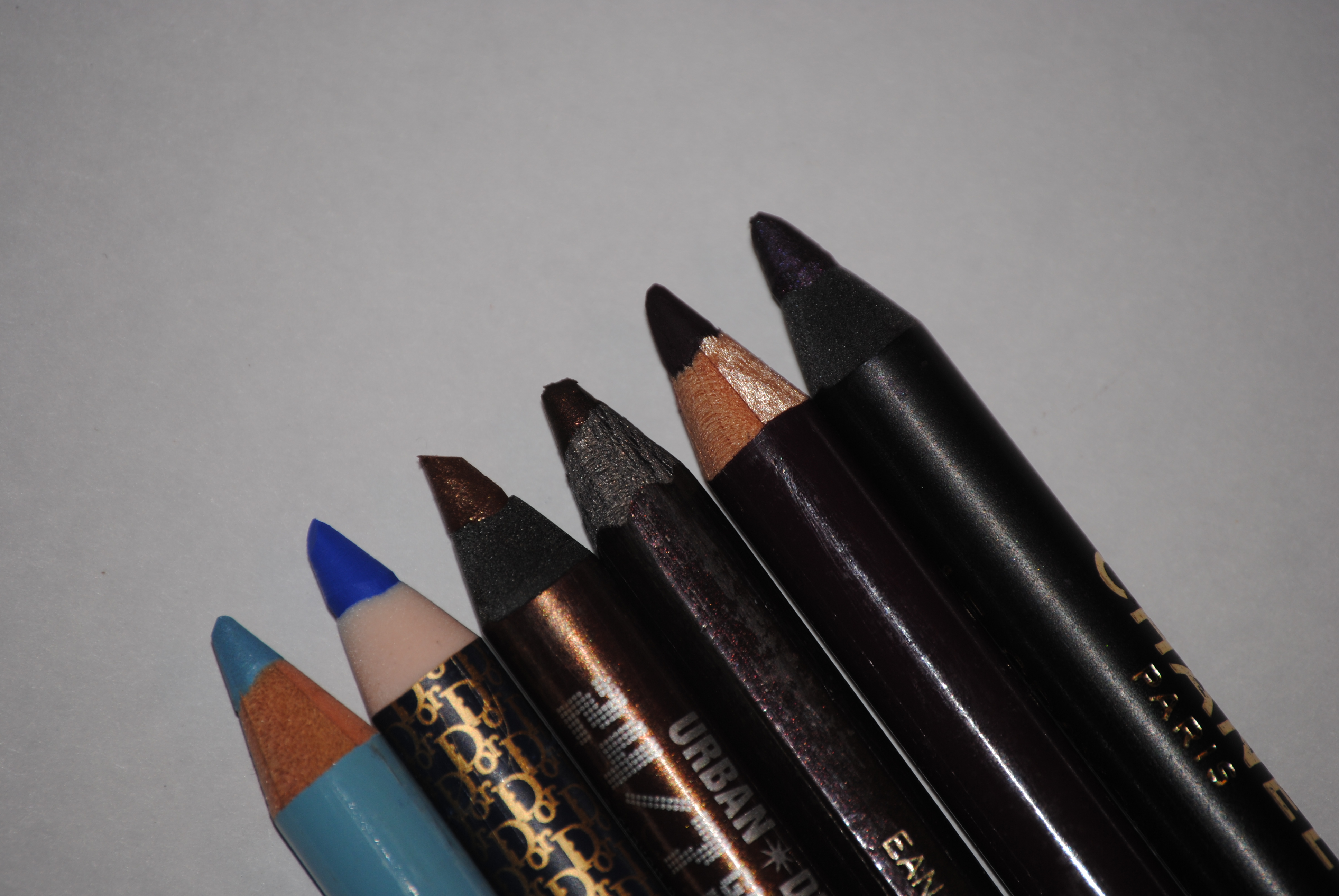 Apart from Urban Decay’s ‘Bourbon’ (3rd from the left) and CHANEL’s ‘Violet Smoke’ (last on the right), the above liners are all basically a case of “what-was-I-thinking-itis”. Pale blue is not a colour I EVER go for, and I imagine that I must have bought it for a specific look – that’s how long it’s been sitting in one of my makeup drawers. As these are not shades (with the exception of the afore-mentioned) that I prefer for the most part, they will not be with me for much longer…no need to go into more detail about these!