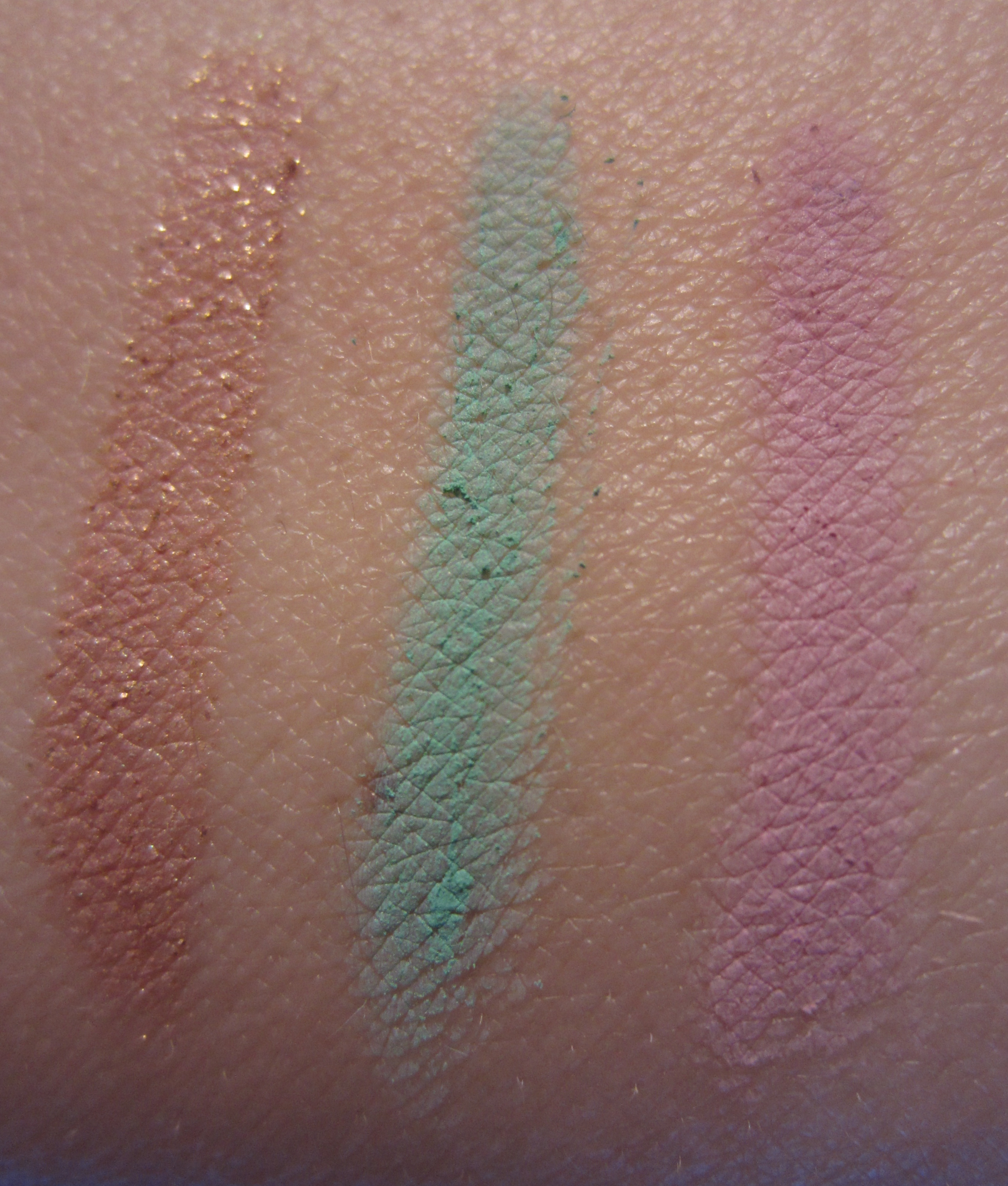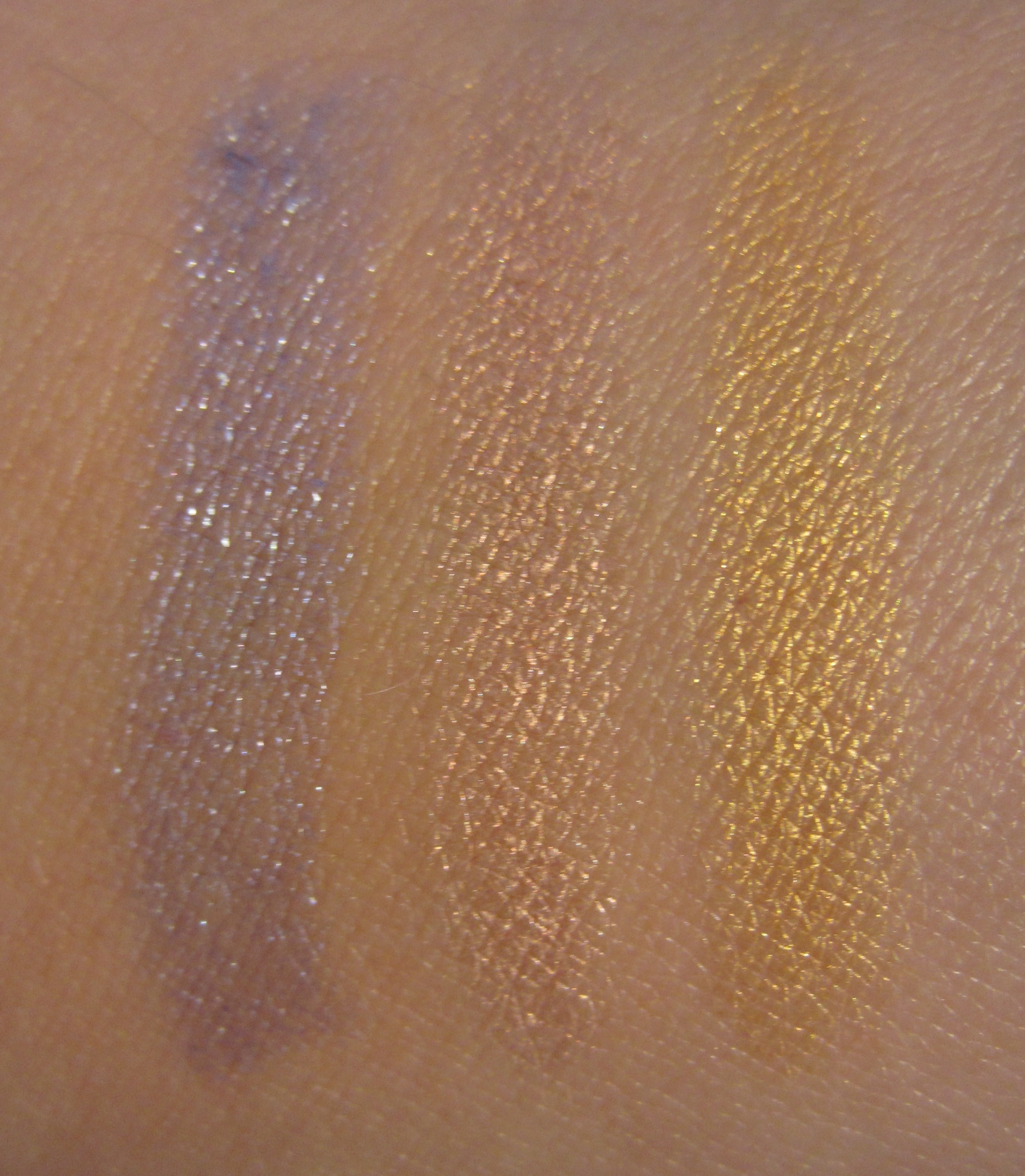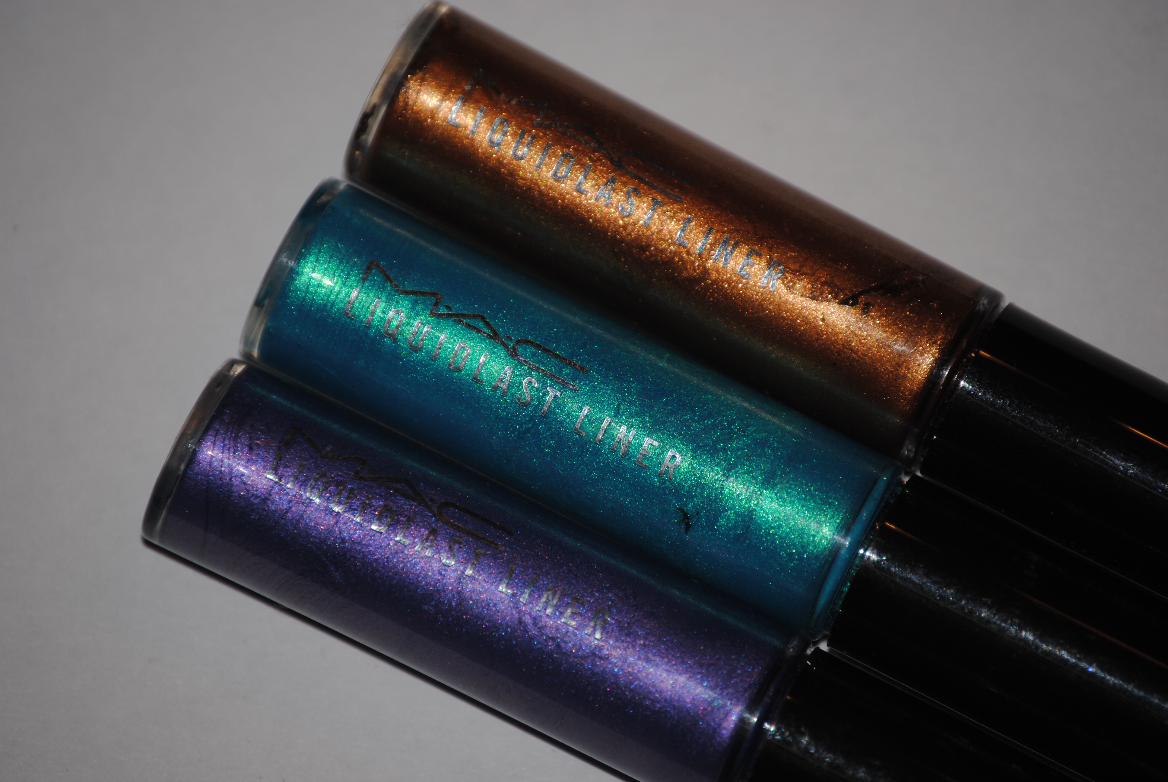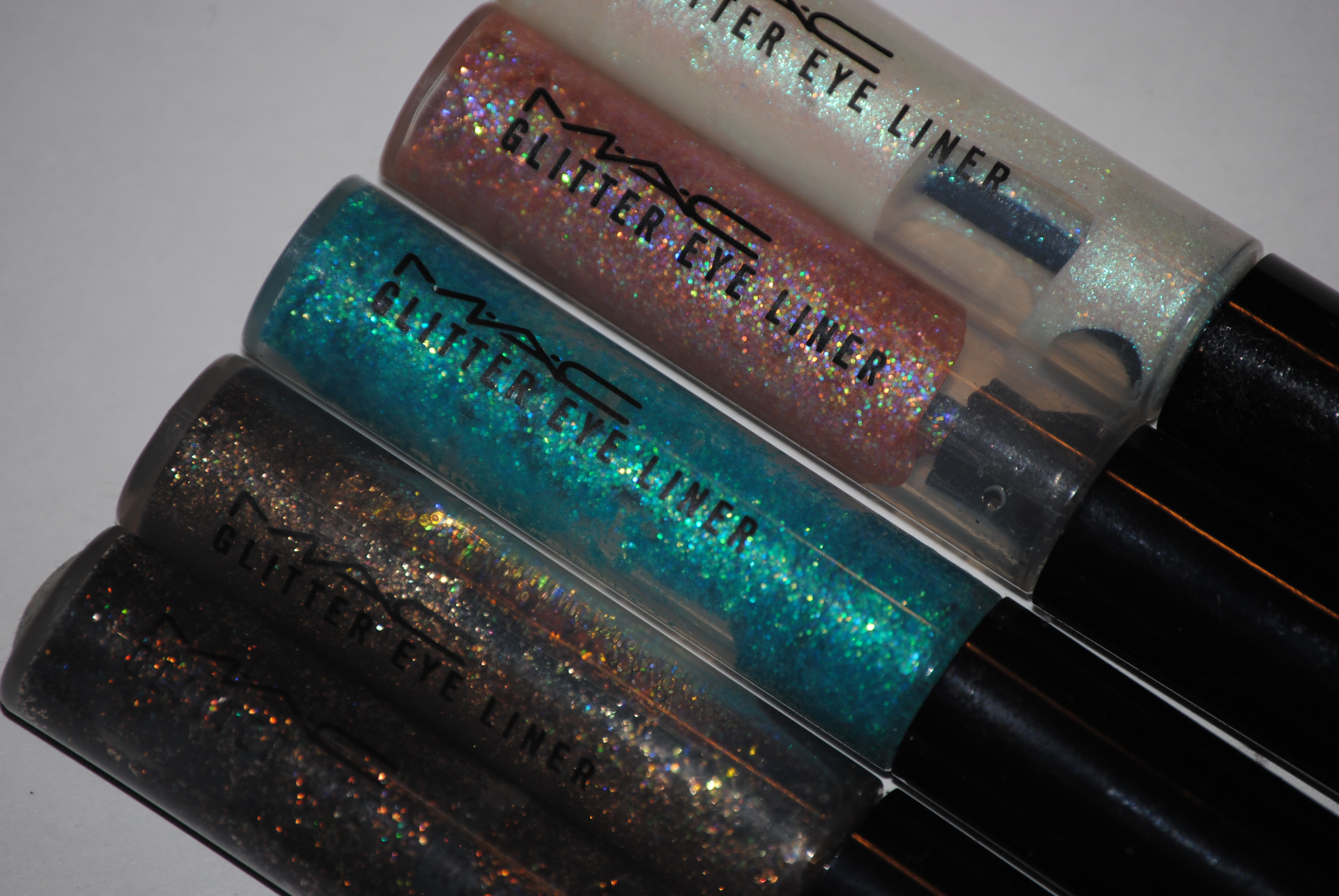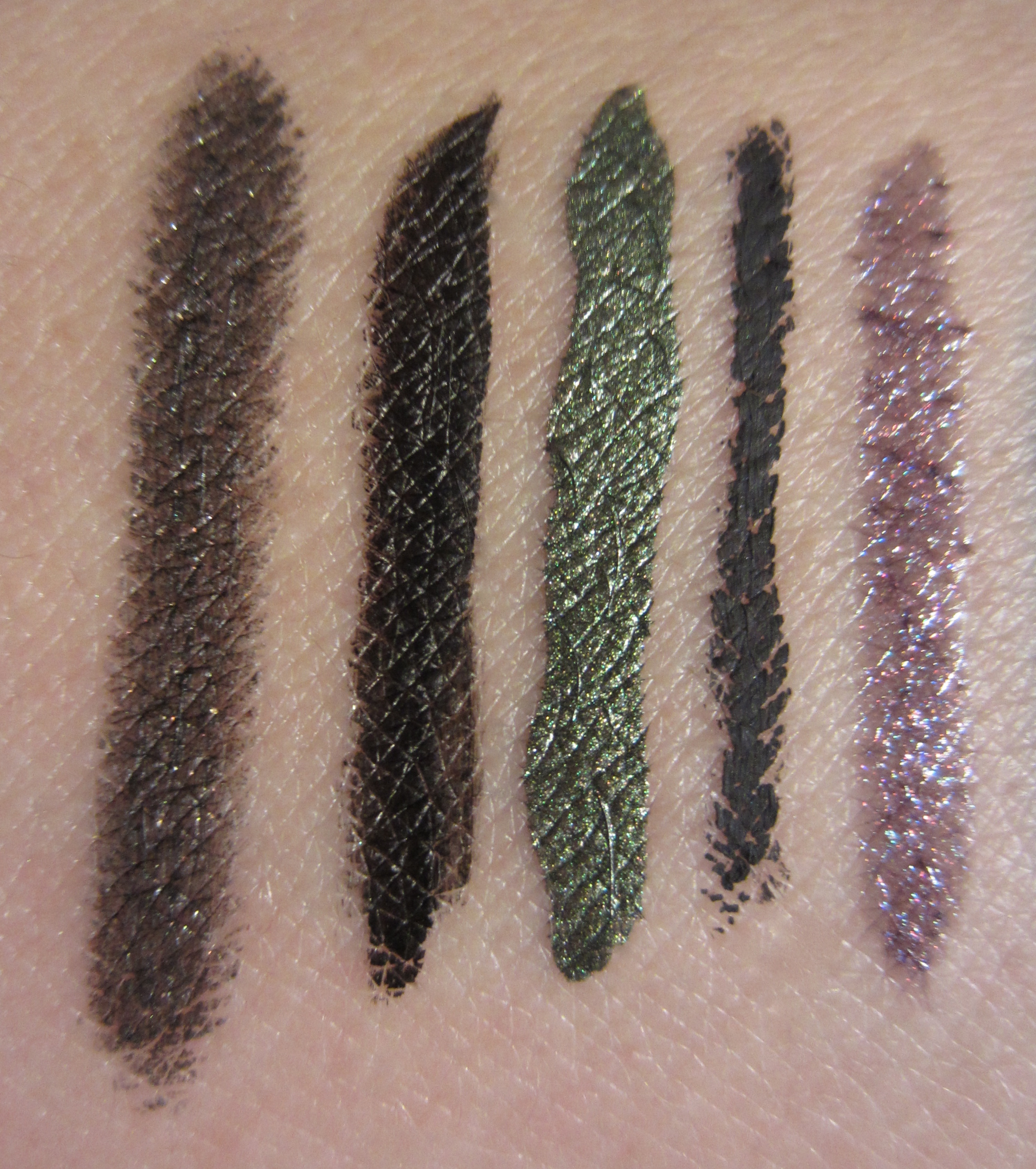Obviously, glitter liners are more a novelty/evening item, than something you can use daily, and I began my little collection with MAC’s ‘Peacocky’ (center), primarily because of the colour. It also happens to be the one glitter liner I did use quite a bit of, primarily above the iris for emphasis & along the outer edge of the eye for a different take on a “cat-eye” look, but upon swatching it, to my dismay, I found that it has clumped and dried up – with the same fate having occurred to ‘Oxidate’ (left). ‘Her Glitz’ (2nd from left) and ‘Girl Groove’ (far right) from MAC’s 2009 Hello Kitty Collection, are still very viable and wear exceptionally well; ‘Her Glitz’ looks amazing on its own, while ‘Girl Groove’ has transformative powers when layered over shadow liners, and so they will definitely be sticking around, although I don’t see any more glitter liner additions to my collection in the foreseeable future.