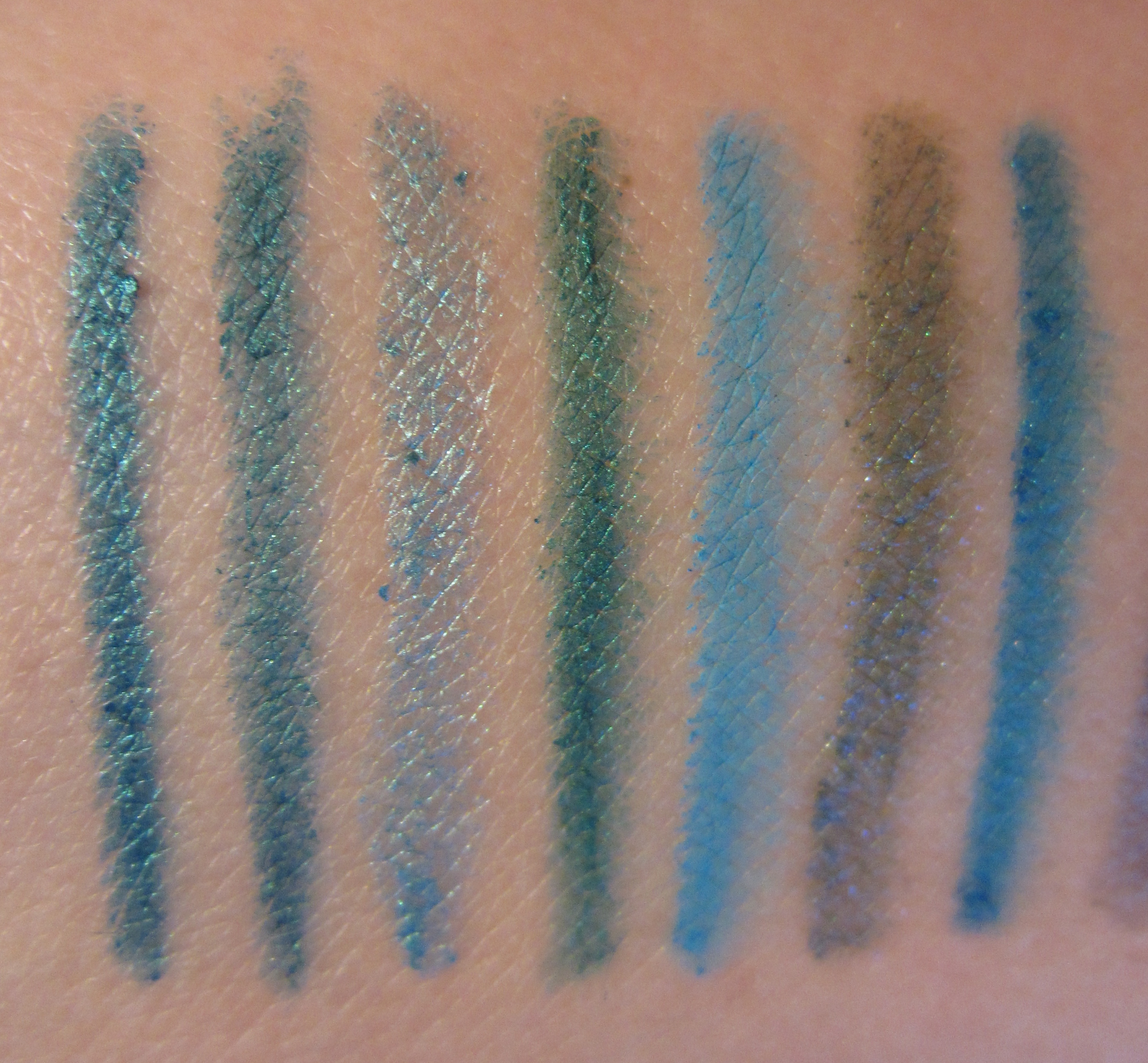 I confess to having a total weakness for the colour teal, and when it comes in the form of shimmery eye liners, I’m sold. The first two liners (from the left) are from MAC’s excellent 2010 & 2011 summer collections respectively, and while they appear almost identical, there were slight variances in the density of pigment, as well as one leaning slightly bluer than the other. My first teal-ish pencil, was MAC’s ‘Out To Sea’ (5th from the left), and while it’s almost a sky blue by comparison as well as non-metallic, it looks amazing on the waterline, albeit difficult to have it stay in place there. The Urban Decay (last on the right) is once more the softest gliding of them all, as well as the longest-lasting. MAC’s ‘So There Jade’ (3rd from the left) and ‘Bankroll’ (2nd in from the right) were somewhat disappointing, as I found the colour payoff did not meet my expectations with regards to waterline application, and thus better suited to lining over and/or under the eye. MAC’s ‘Minted’ (center) is a simply stunning jewel like jade hue with great versatility, pigmentation and application – a keeper!