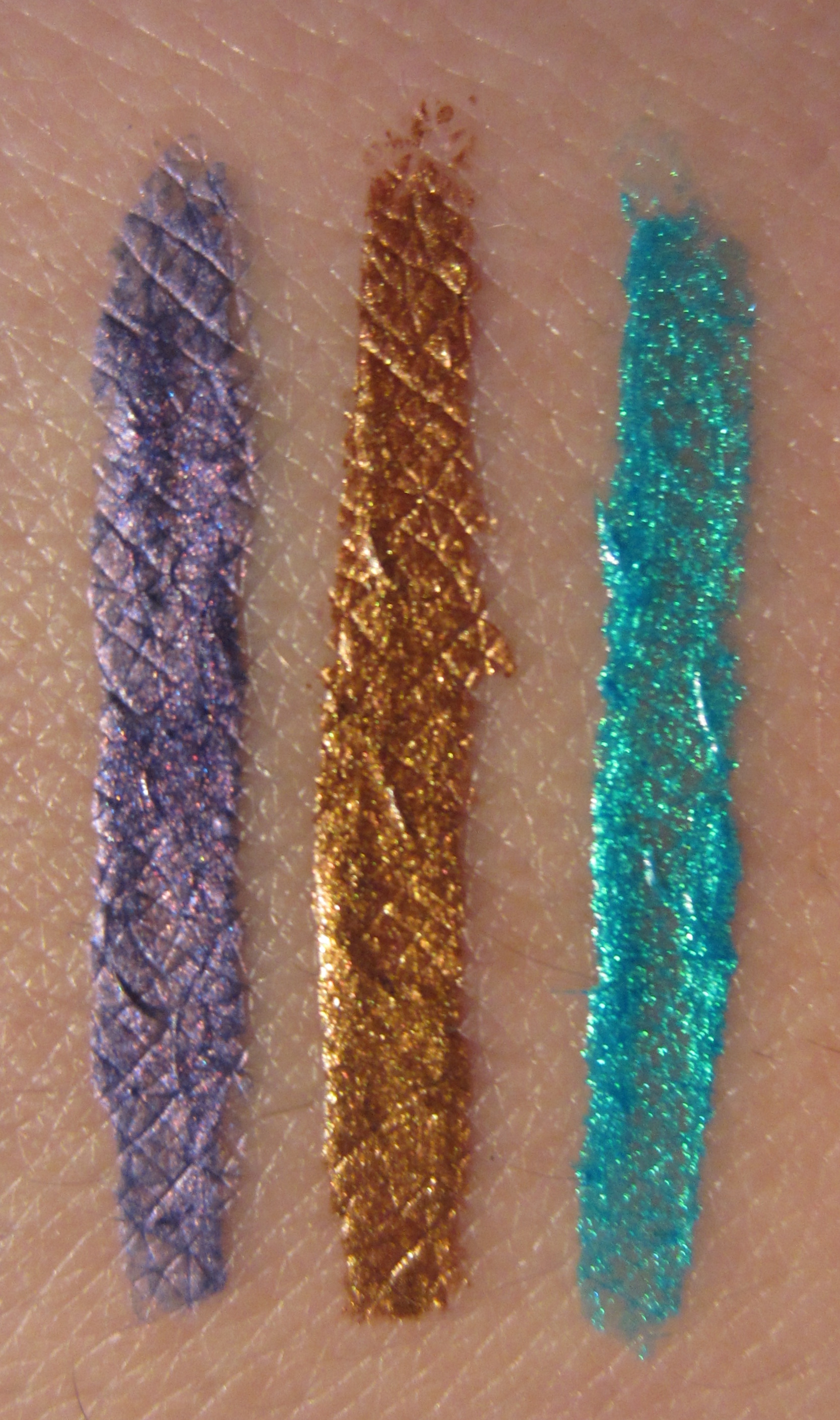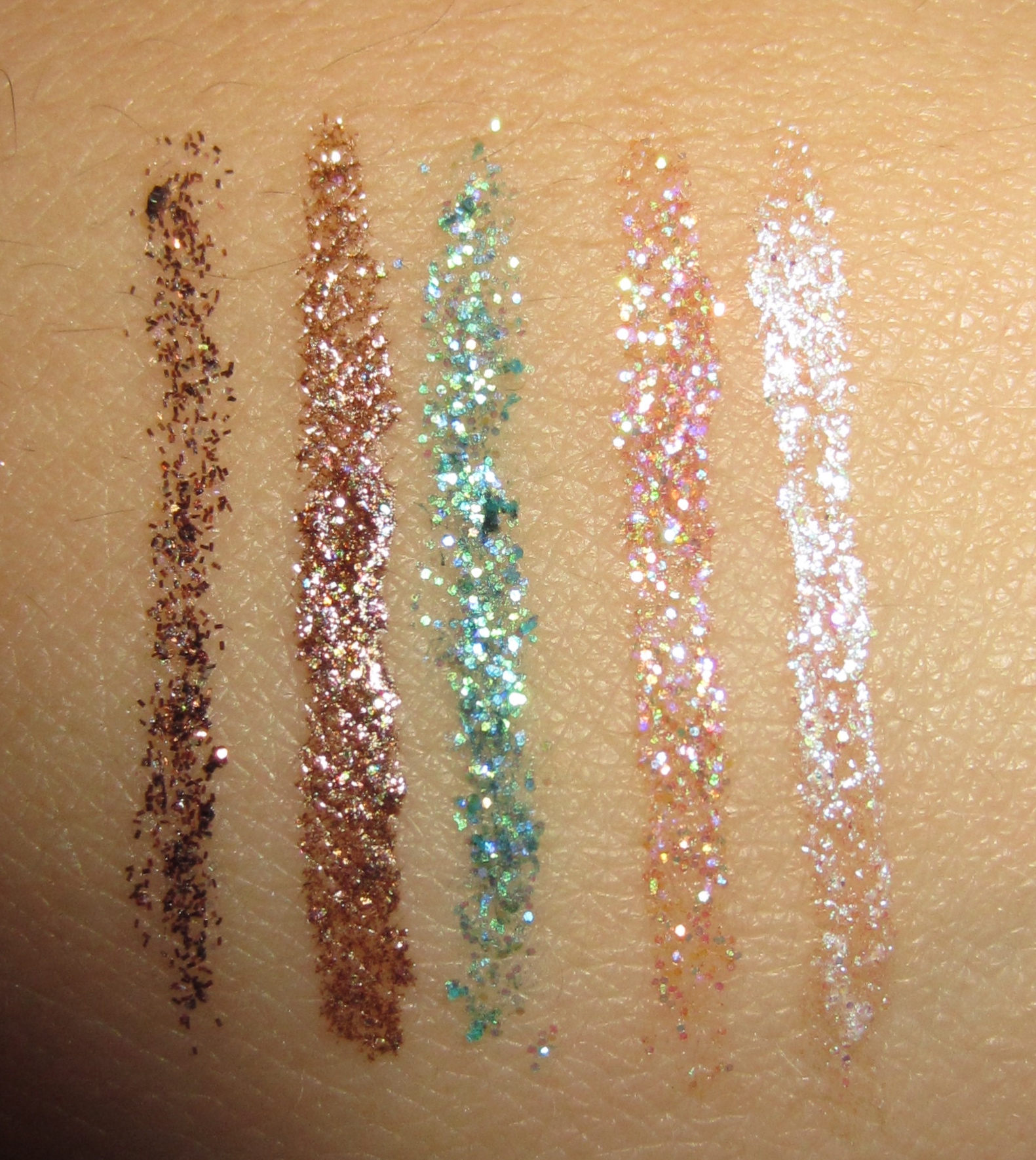 I’ve included this flash shot of the glitter liner swatches, in order to highlight their prismatic reflections – so pretty & festive looking!