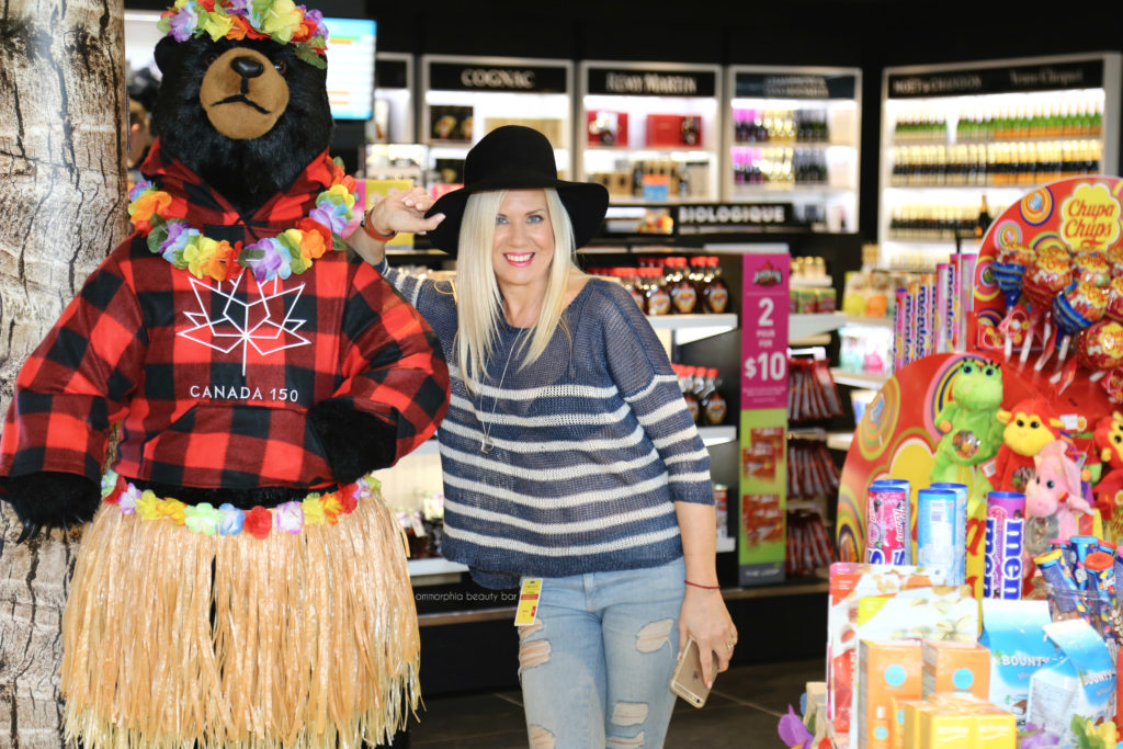 During my last photo trip at The Loop Duty Free, I felt like a kid in a candy store. Or a beauty addict in a makeup store, would probably be more accurate … but I digress. This premiere duty-free store located at Montréal’s Pierre Elliott Trudeau Airport, had transformed into a carnival of colour with tons photo ops to be had. For example, see above: I mean, it’s a bear in a hula skirt complete with a lei — how can anyone resist?