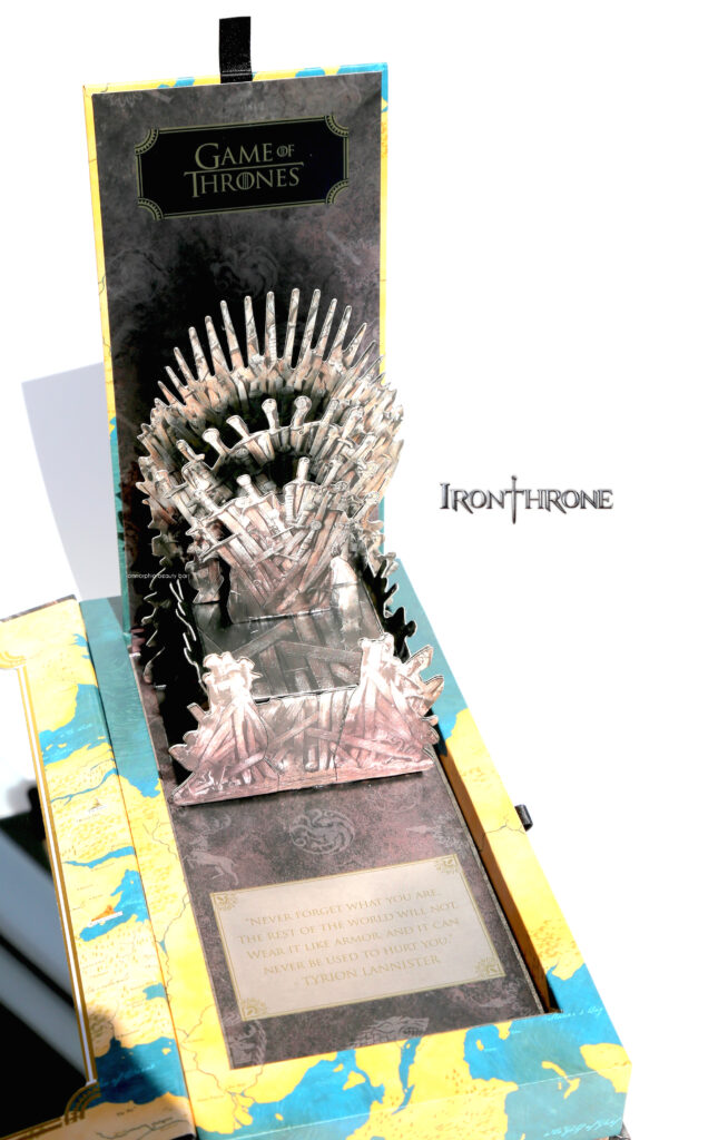 Pulling up on the ribbon tab reveals a 3D pop-up of the Iron Throne, along with a quote by Tyrion Lannister, Hand to the Queen.