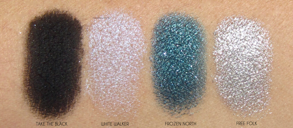 Defeating the White Walkers| This quad leans decidedly cool & wintry. The White Walker shade is utterly unique with its blue-pink prismatic shift, while Free Folk is a truly intense metallic silver. I was actually surprised by how sooty Take The Black is considering it has glittery bits, while Frozen North is just a stunning deep teal.