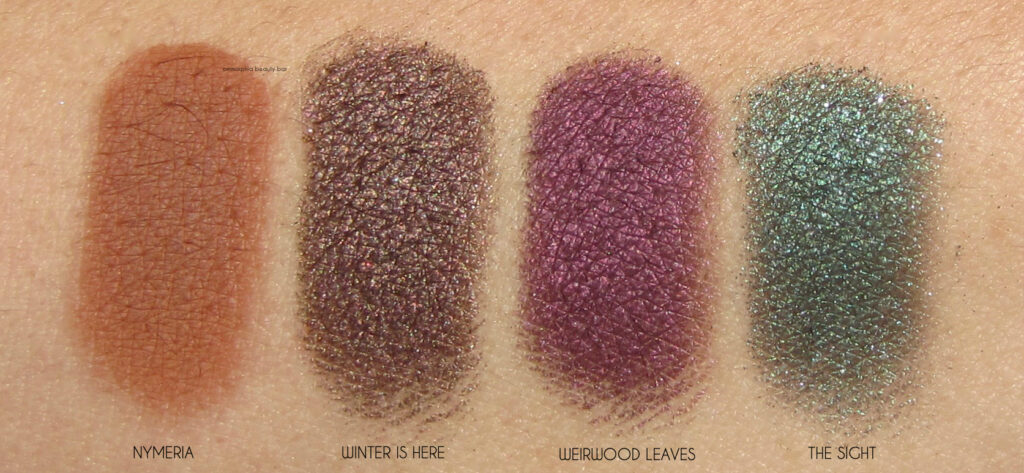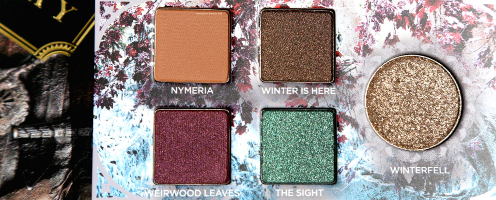 House Stark | The rich & warm leaning jewel tones of this quad make it distinct from the rest. Nymeria has a buttery texture along with rich pigmentation, looking equally good on its own or used as a transition shade in the crease, while the lush bronze of Winter Is Here helps to add definition and depth. Both Weirwood Leaves & The Sight are perfectly executed colours as depicted in the book, along with being the most stunning plum wine and forest green hues, respectively.