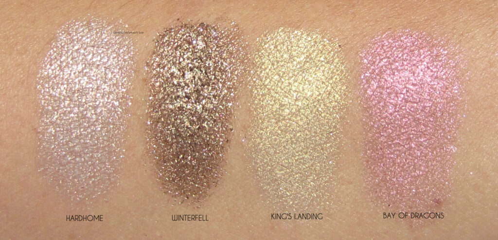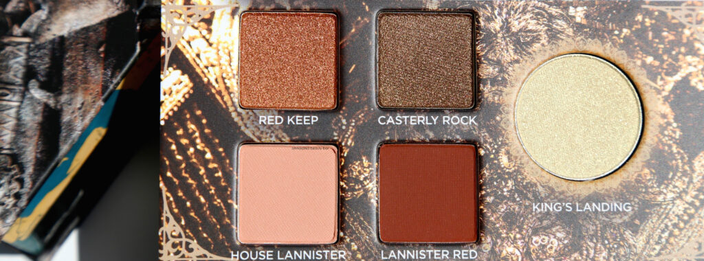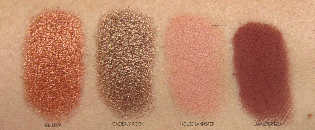 House Lannister | Inspired by red, the signature colour of House Lannister, all 4 hues in this quad are completely in my wheelhouse. The brilliant copper of Red Keep and the complex shimmery bronze of Casterly Rock are both so visually arresting. Surprisingly, House Lannister has a surprisingly strong colour payoff considering that it appears as a light peach in the pan. Finally, Lannister Red is unbelievably pigmented (even if it does resemble the colour of dried blood, as creepy as that might sound — but so appropriate, all things considered).