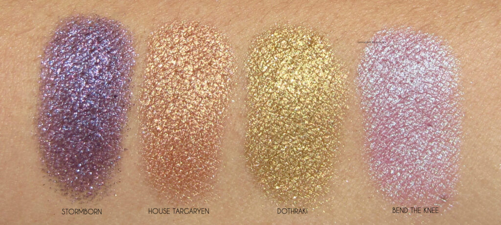 House Targaryen | This last quad of the palette may have the most complex shimmers of them all, and portrays its royal status via the inclusion of both purple and gold hues. Stormborn, representative of Daenerys Targaryen’s birth during a wild stormy night, is a deep purple filled with stars (ok, it’s actually glitter, but stars sounds better), while Bend The Knee is an intricate lilac with a blue/green/pink shift that is as hard to pin down as the Khaleesi herself. The utter brilliance of Dothraki pays homage to the gold revered by the Horse Clans, and truly applies like molten gold. Lastly, House Targaryen seems to combine the best of both gold & purple, creating an entirely new shade in the process.