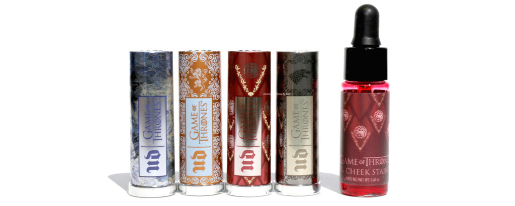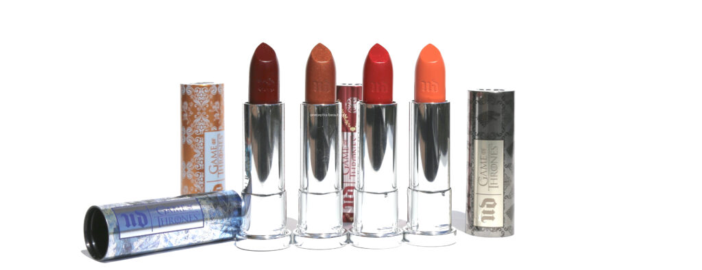 Game of Thrones Vice Lipsticks (CAN $23.00/each) | With exterior casings depicting each House’s sigil and representing 3 of the powerhouse women in the series with the 4th oddly enough drawing inspiration from a completely unexpected source, the four lipsticks of this collection come in the brand’s Vice format and offer up 3 finishes: sheer, metallized and matte. The textures on all are buttery smooth and with the exception of Sansa Stark which has a mid-sheer finish, they display excellent staying power as well. As they are all within the same colour family, you can even layer them up to create entirely new lip combos, thus increasing their versatility.
