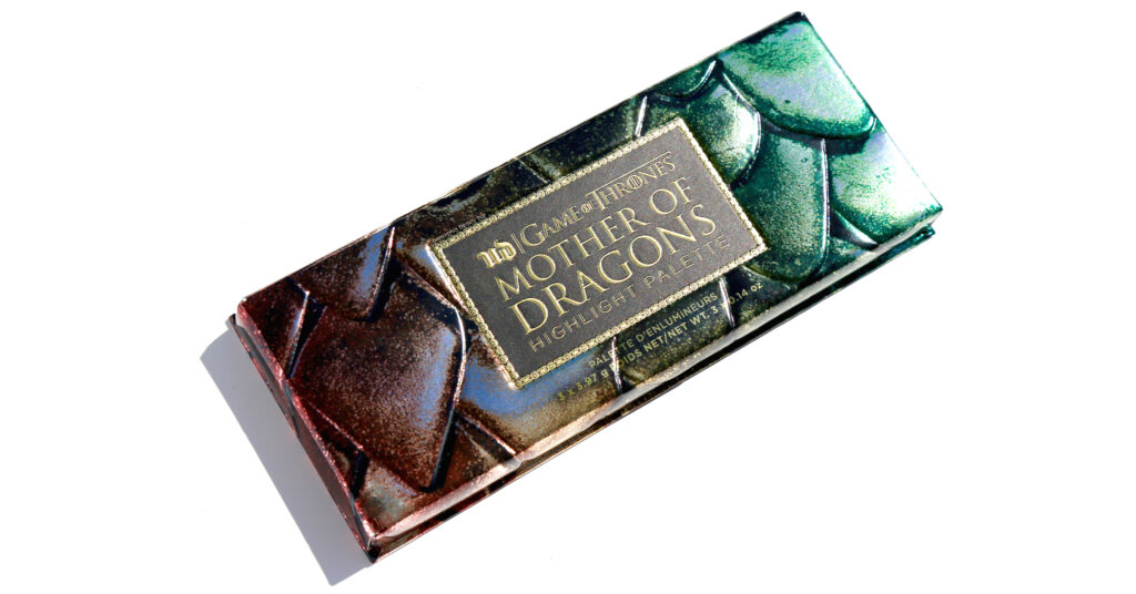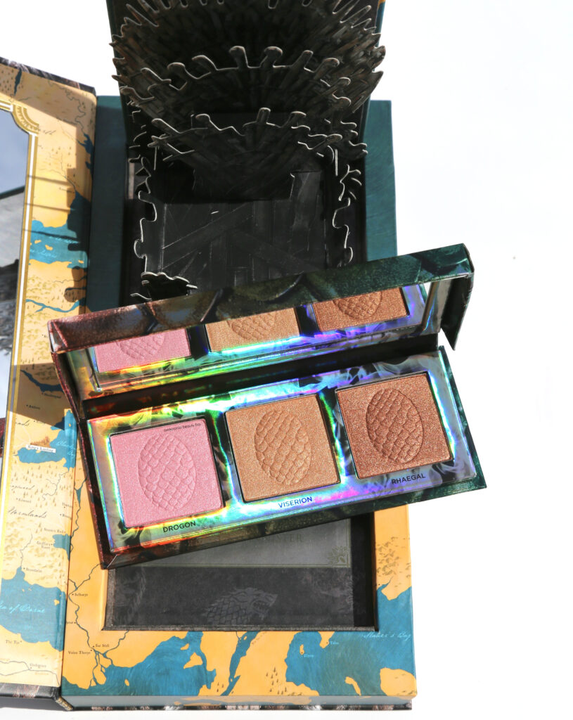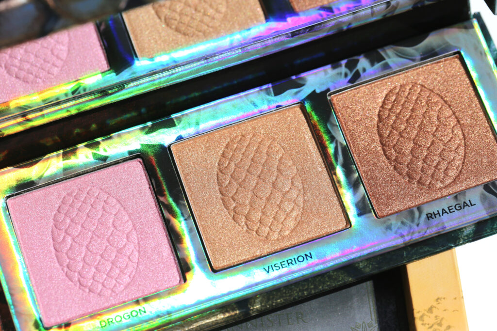 Game of Thrones Mother Of Dragons Highlighting Palette (CAN $45.00) | Housed in a sturdy cardboard compact that comes with a metallic closure, the iridescent raised dragon scale design on the exterior is absolutely stunning. On the inside are three new highlighting shades in the brand’s Afterglow formula, each embossed with a “dragon egg” and which draw inspiration from Daenerys Targaryen’s 3 dragons. Created to provide up to 8 hours of wear, you can add to their staying power by applying them over primer/foundation. The silky texture blends out easily along the skin and all lay down smoothly, leaving behind a gorgeous glow that doesn’t appear to emphasize pores.