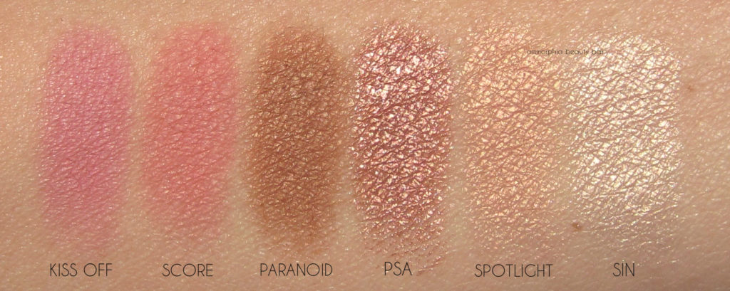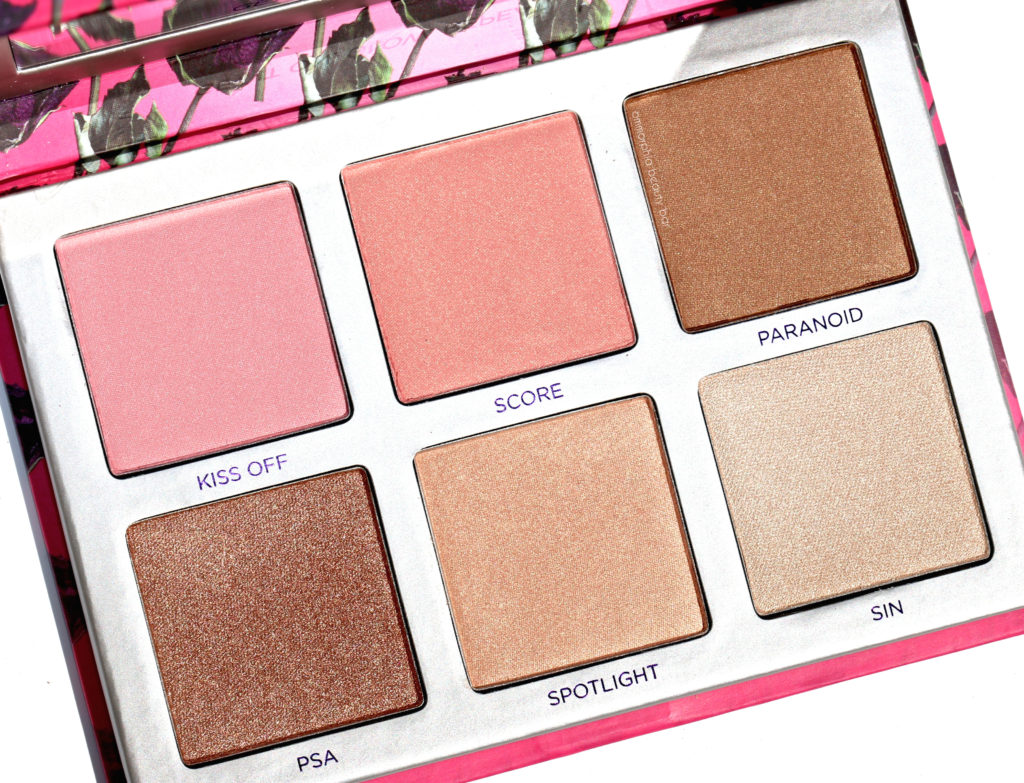 SIN Afterglow Palette Highlighter + Blush (CAN $50.00) | Housed in hot pink sturdy cardboard packaging that’s covered in purple roses, the inner lid bears a full-size mirror and the whole caboodle snaps securely & magnetically shut. The top tier holds 3 universally wearable blush colours in the brand’s finally milled powder formula that’s highly pigmented and which blends out effortlessly along the skin, while the bottom row has 3 highlighters that will also suit a broad variety of skin tones, with a formula that is buttery smooth and utterly brilliant — yet never overpoweringly so. You can even customize the shades by mixing & layering them together, thereby creating unique new colour combinations and finishes. When worn over primer/foundation, the staying power of all is excellent throughout the wearing, showing minimal fading in the long run.