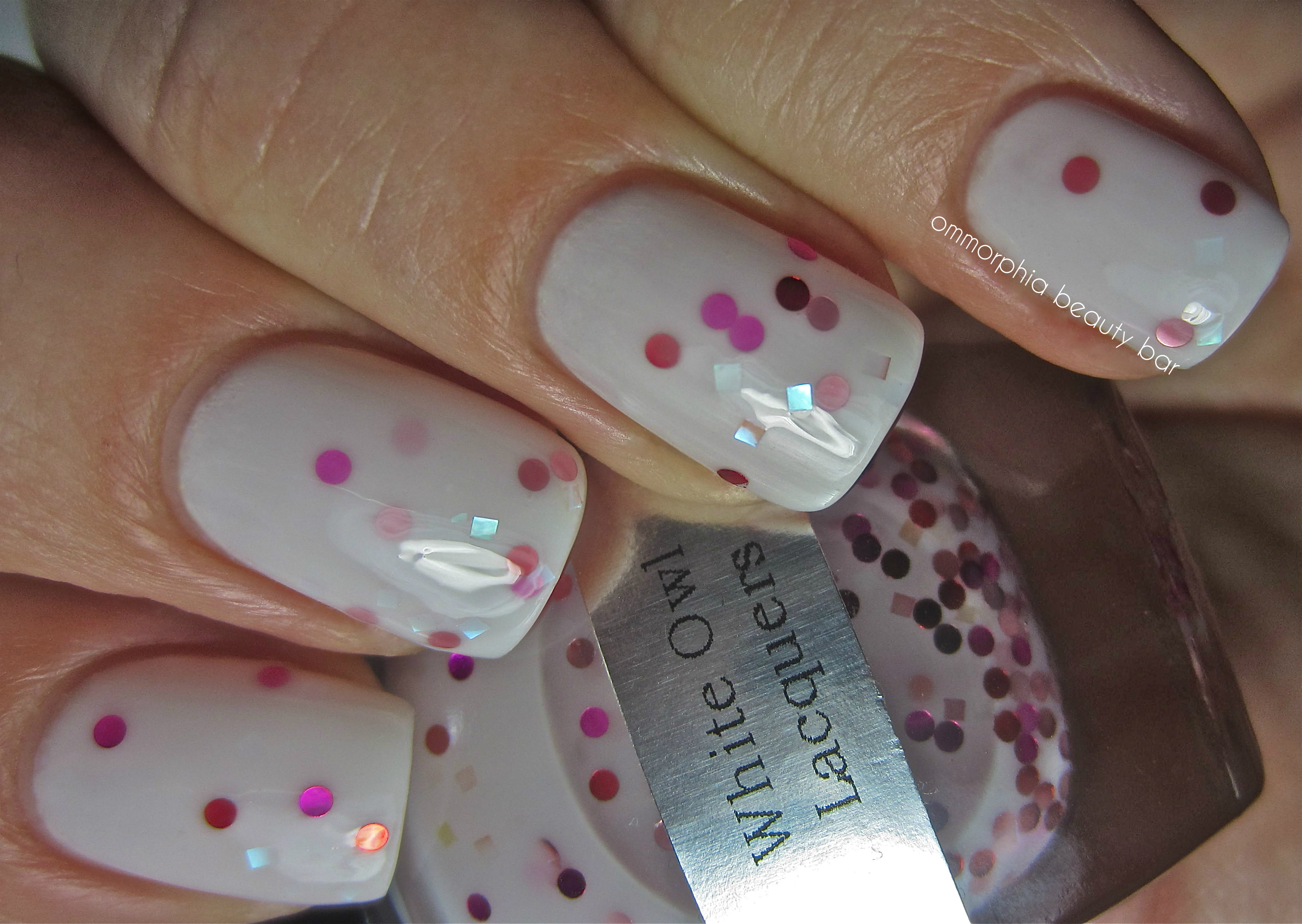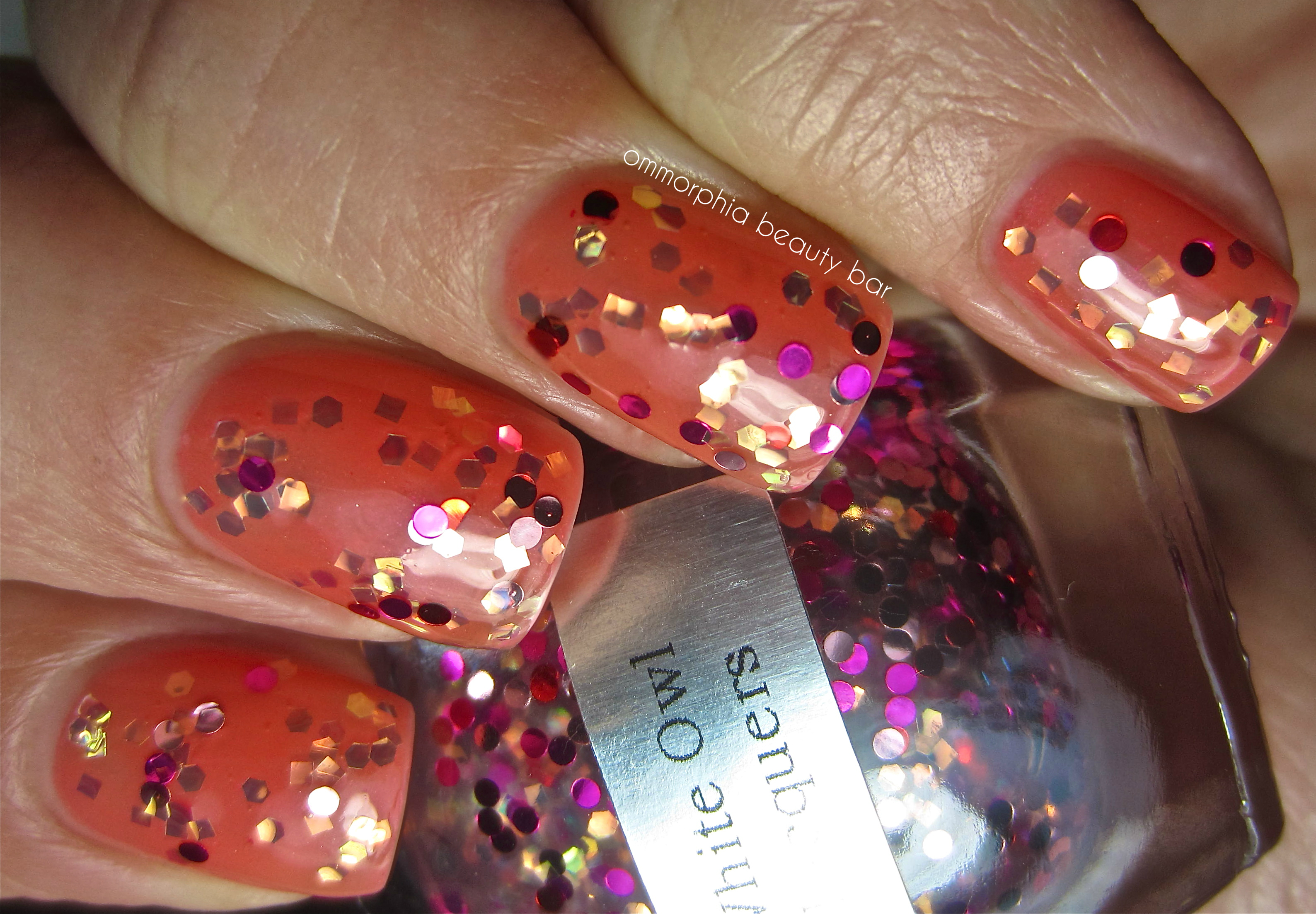 Never Let Me Go – (layered over CHANEL #545 Attraction, reviewed here) a milky white jelly-like base with pink and red round glitter, as well as scattered square prismatic glitter pieces. As there was some fishing/placement needed for application, I suggest storing this bottle upside down to keep the heavier glitter suspended closer to the surface & ready for use. Apart from that, it was easy to work with nonetheless, and I really love the dreamy effect of the entire look. Coats applied: 2, plus top coat