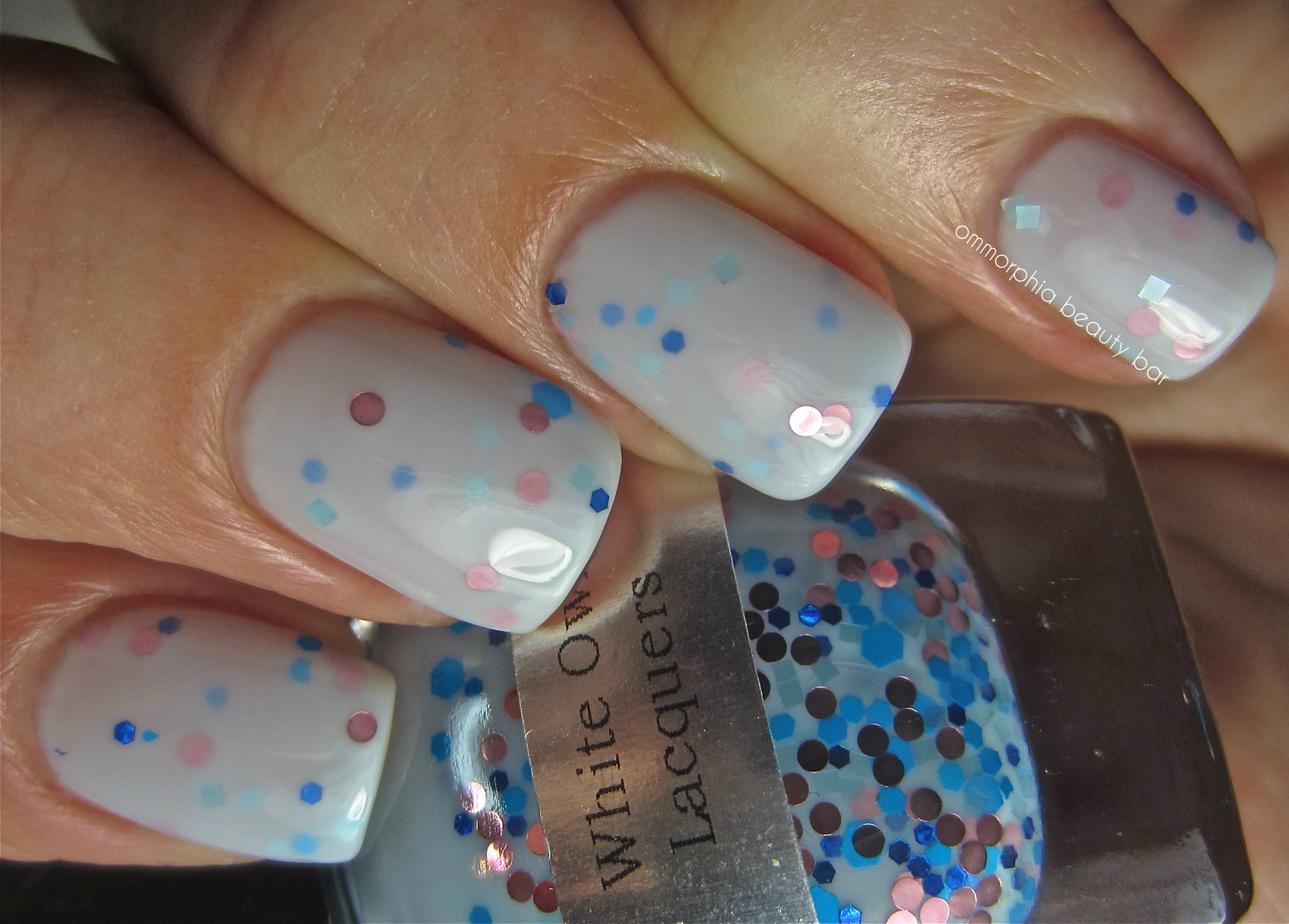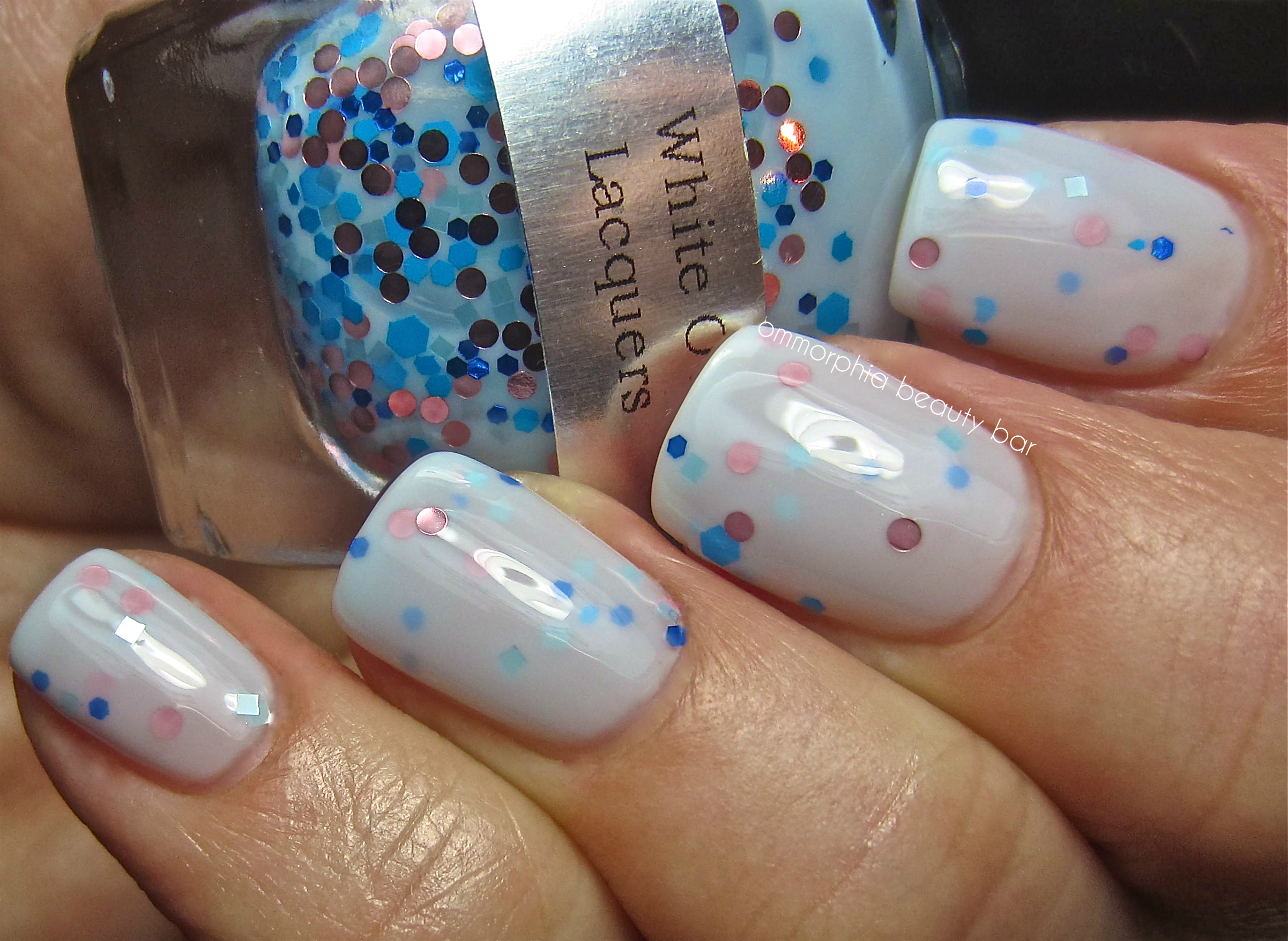 Come To Me – *Please note that while my bottle shows a milky light blue base, I was informed by Mara that this is due to staining caused by the blue glitter and as such, all previous batches of this shade are now being replaced. Personally, I love the way it looks, so my description will be based on my bottle as is.