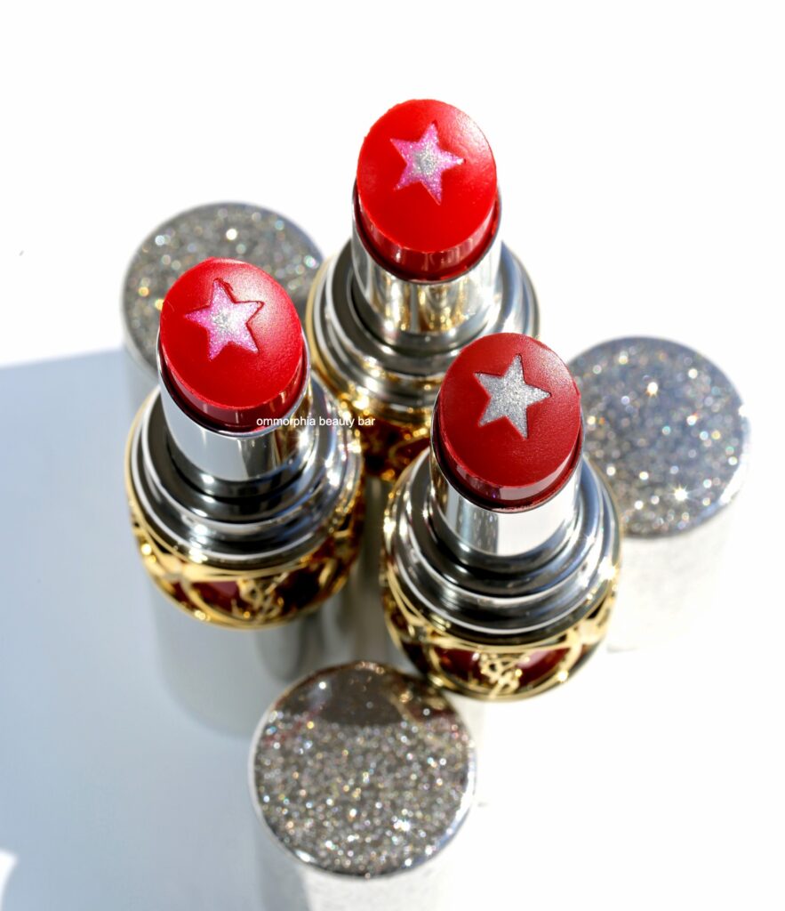 Rouge Volupté Rock’N’Shine Lipstick (CAN $49.00/each) | Housed in hefty silver metal cases with caps featuring a scattering of sparkling glitter (totally evokes a celestial sky, no?), each also sports a band depicting the shade found within along with the iconic “Cassandre” logo. The attention to detail continues with the actual bullet, which displays a shimmering ‘star’ core surrounded by colour. More along the lines of lipstick-meets-balm, I was honestly not expecting the high level of colour saturation they impart. The star’s glitter is of renewable plant-based origin, and is said to melt onto lips, while the fresh mango scent is soft & pleasing, but which also dissipates quickly. Application is effortless, with the creamy buttery texture literally gliding along the lips. Staying power is colour-dependant, with the lighter shades fading faster while the deeper hues leave a light stain behind. Note that the star’s surface will get “muddied” once you start using the lipstick, but since it runs through the core, its glimmering effect will continue with each swipe.